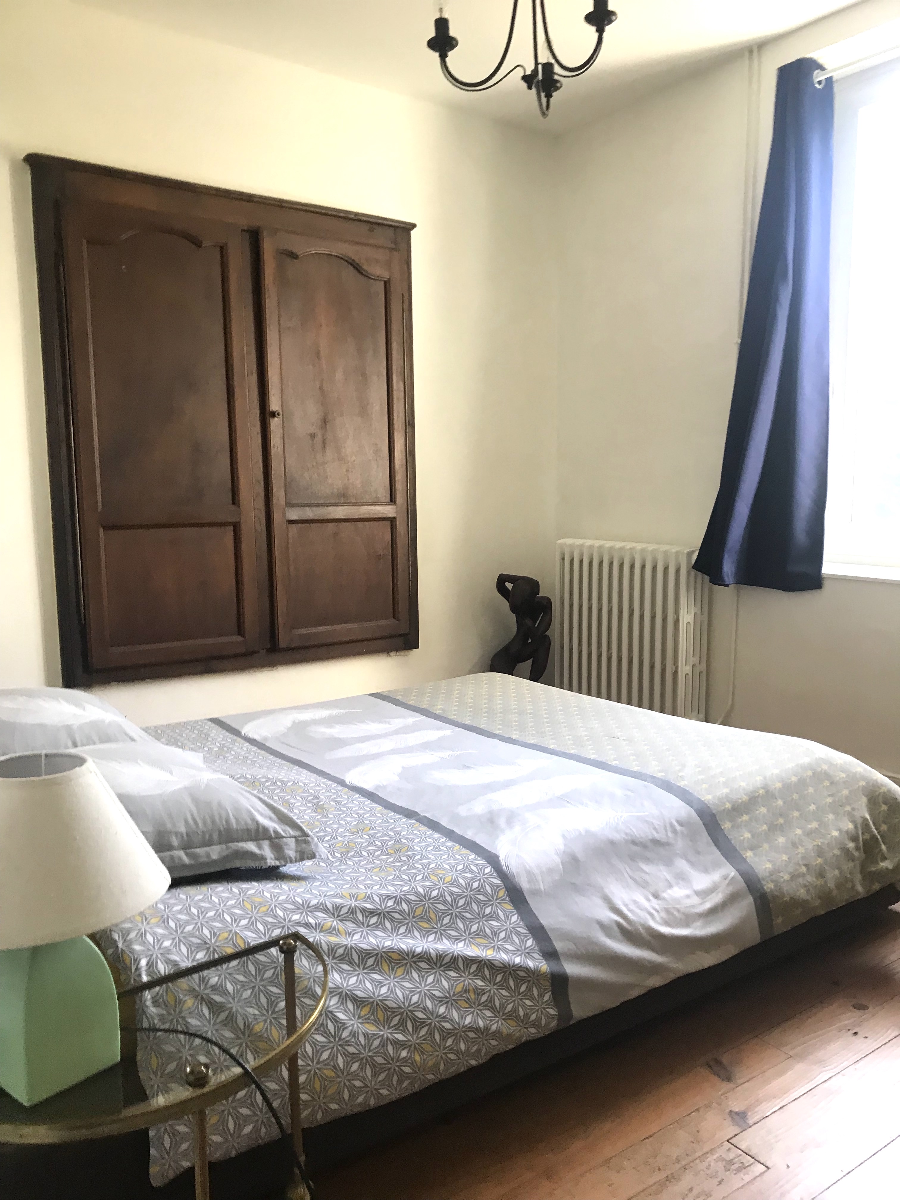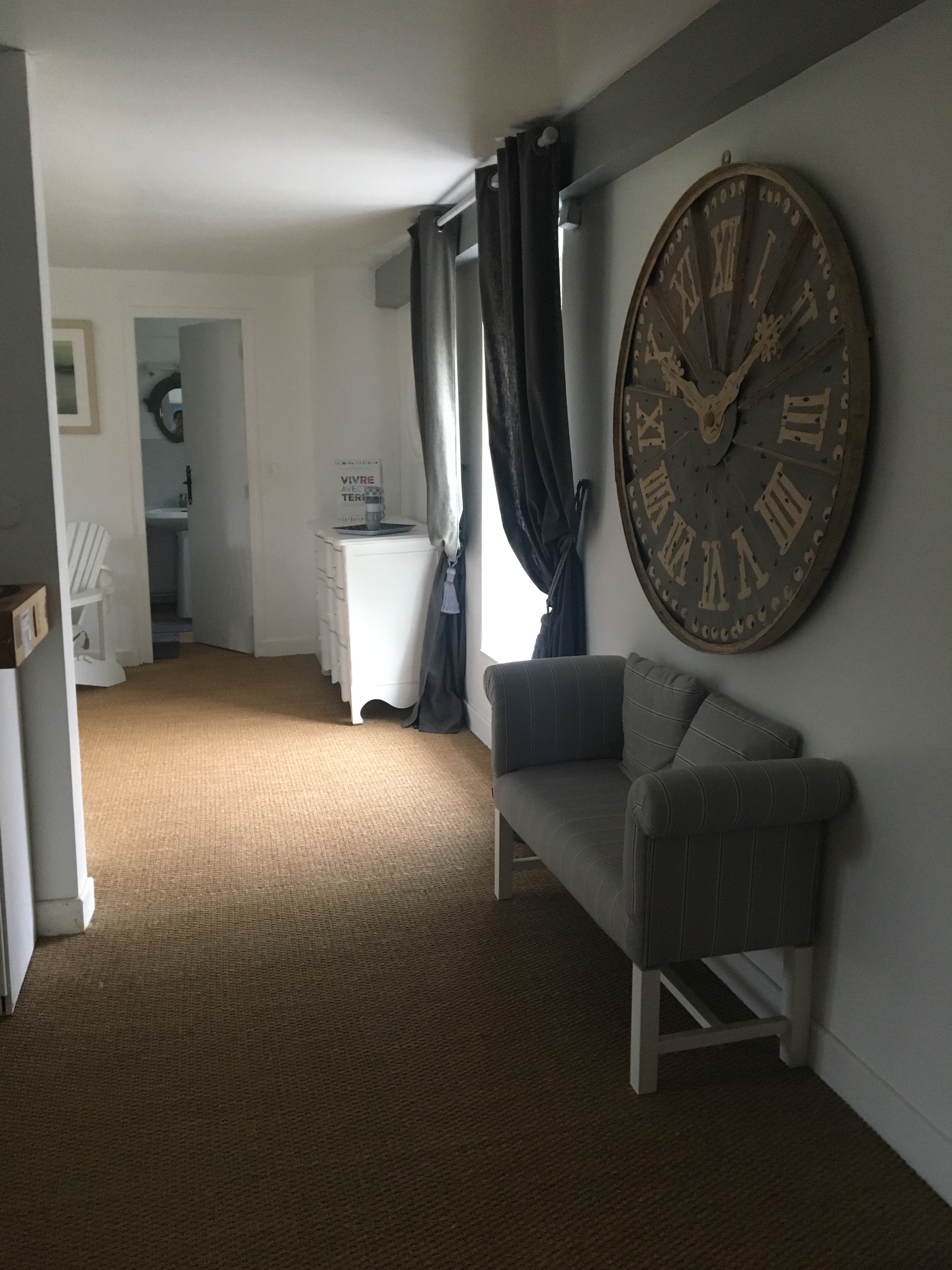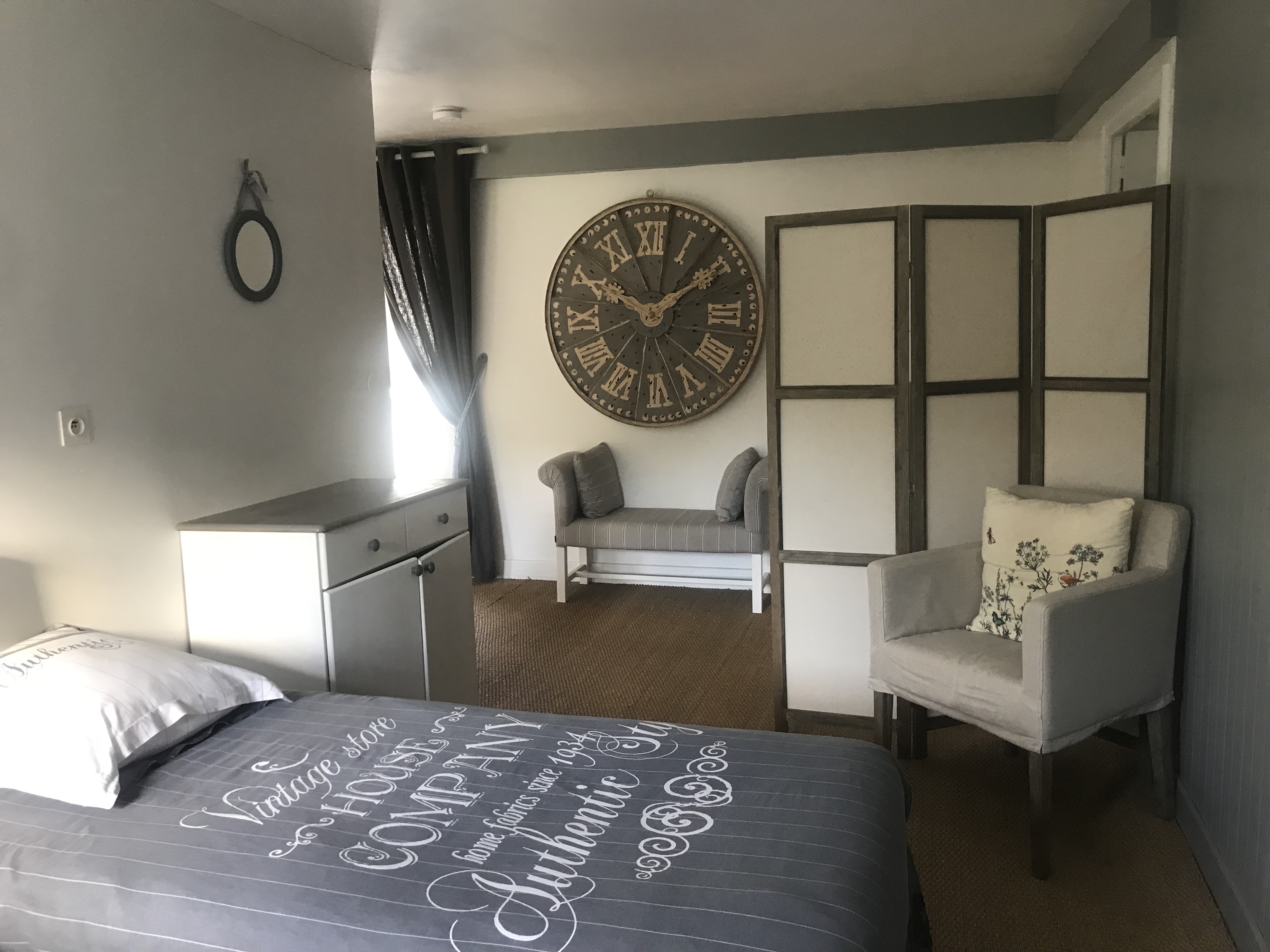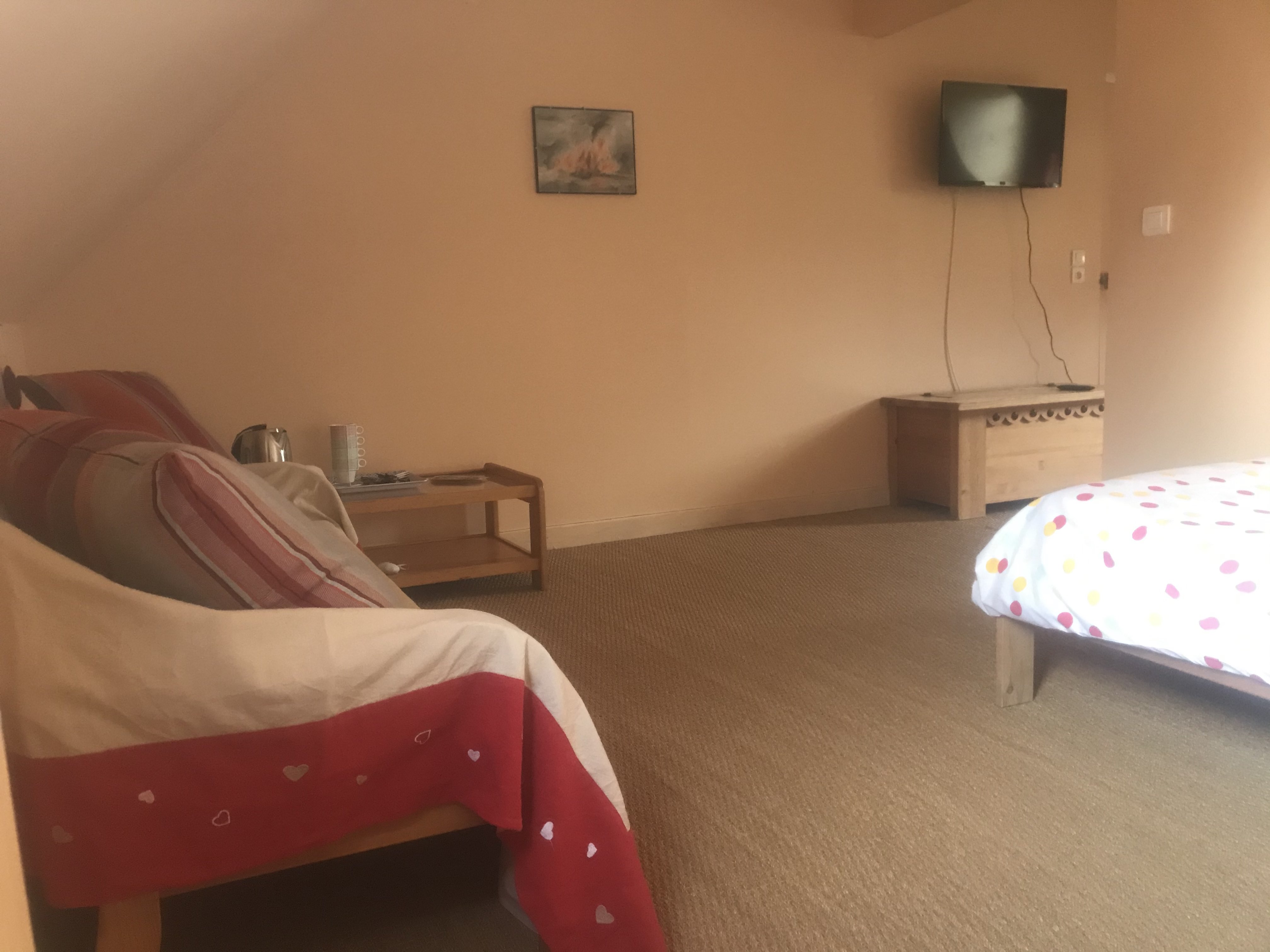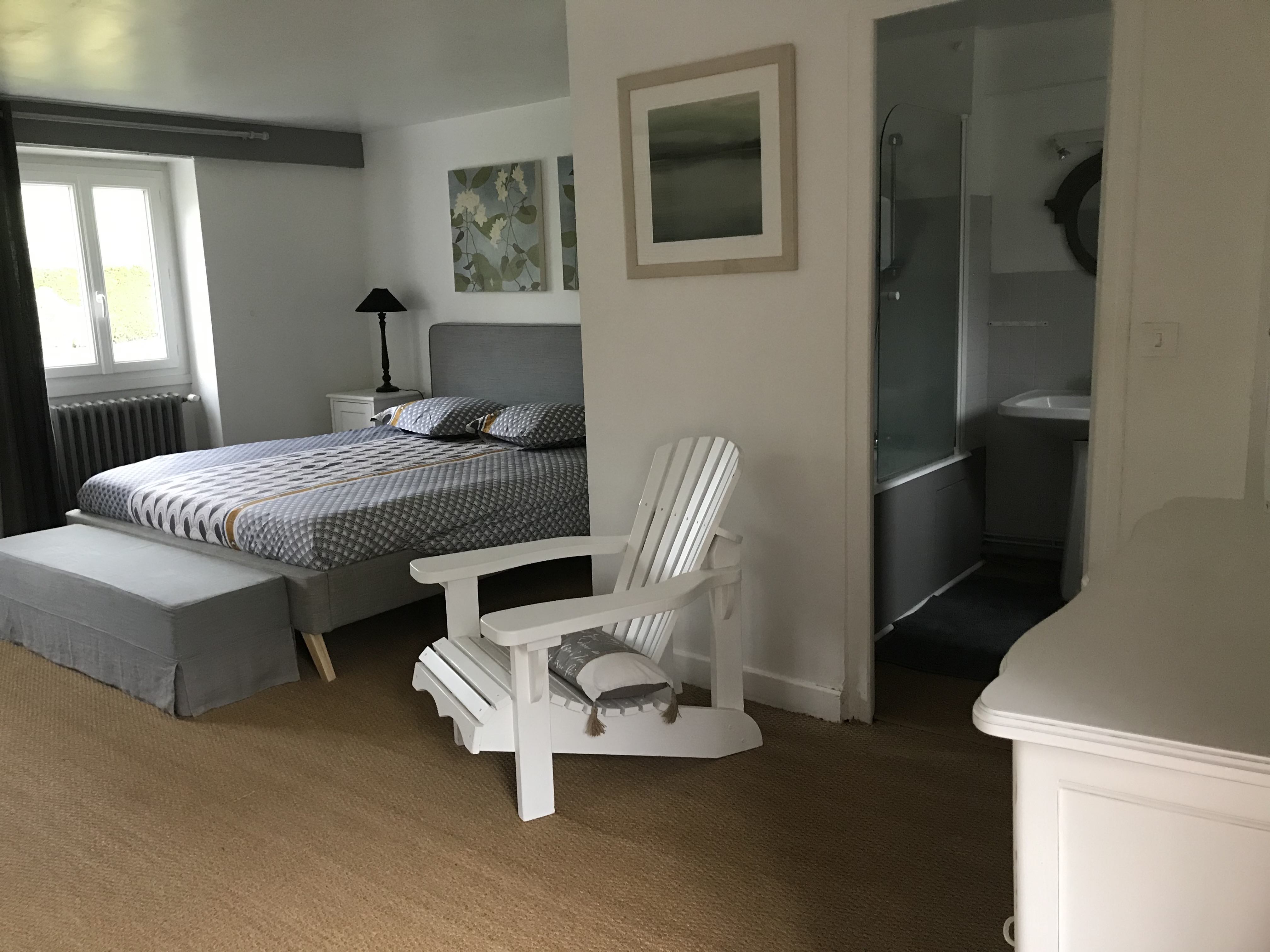 Un grand espace orienté est/ouest avec coin couchages de 2 lits simples séparé par une cloison de la chambre avec un grand lit king size 180×200, une armoire et une commode, TV et fauteuils design et confortables; une salle de bain avec WC.