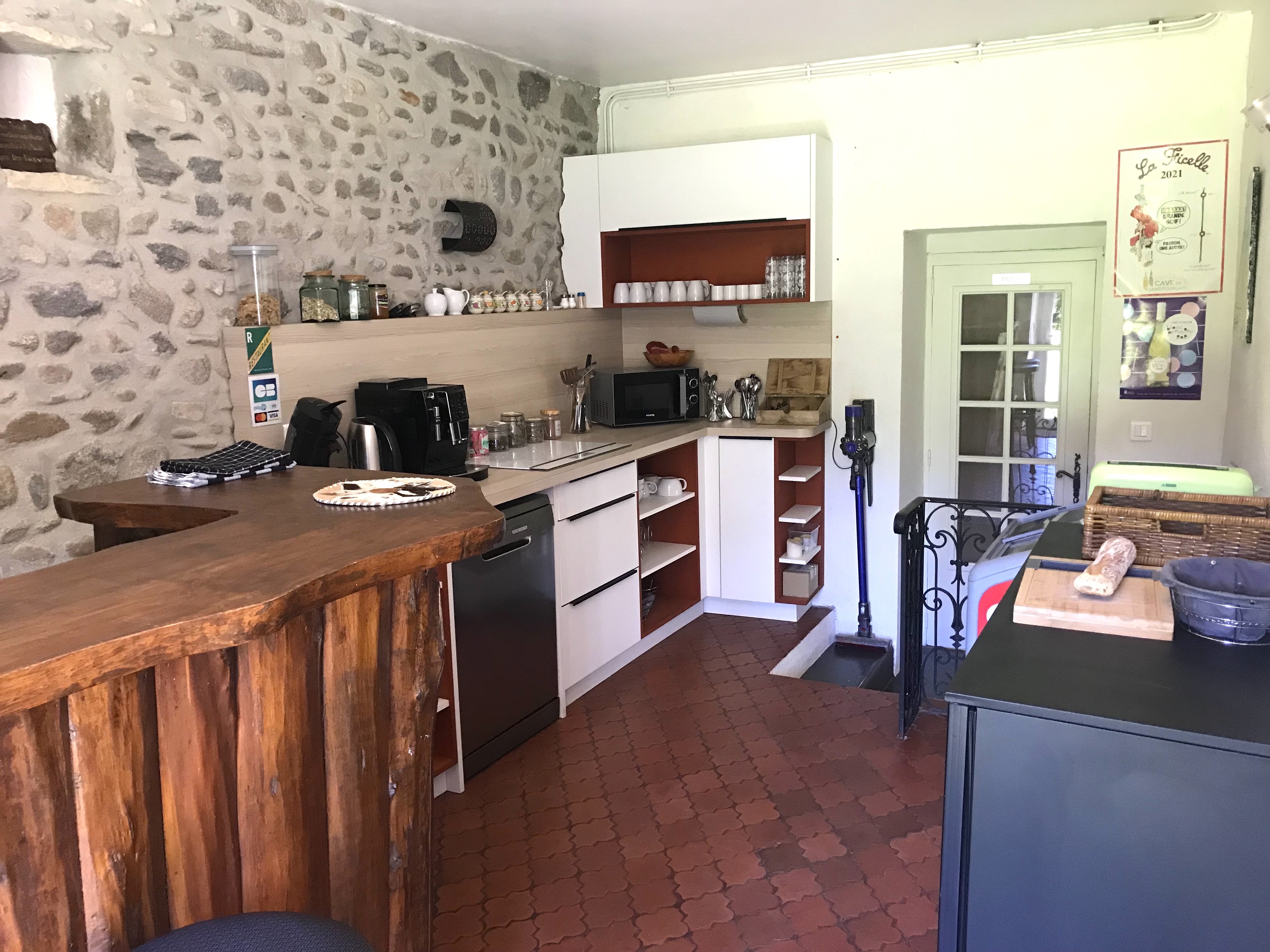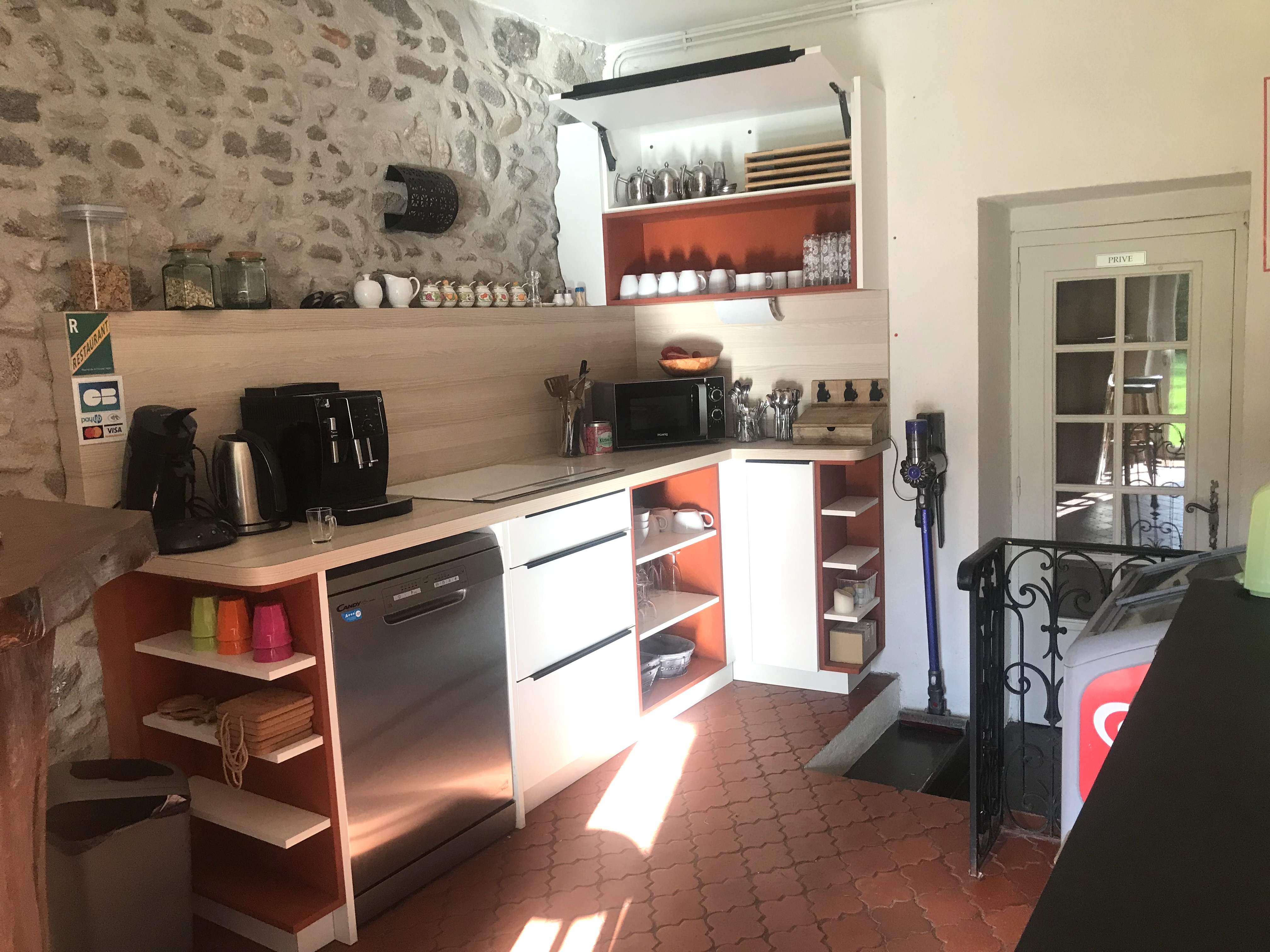 Séparée de la salle Volvic par 5 marches, elle est équipée d’un grand réfrigérateur vitrine, d’une plaque de cuisson à induction 4 feux, d’un lave-vaisselle et d’un évier caché derrière le bar.