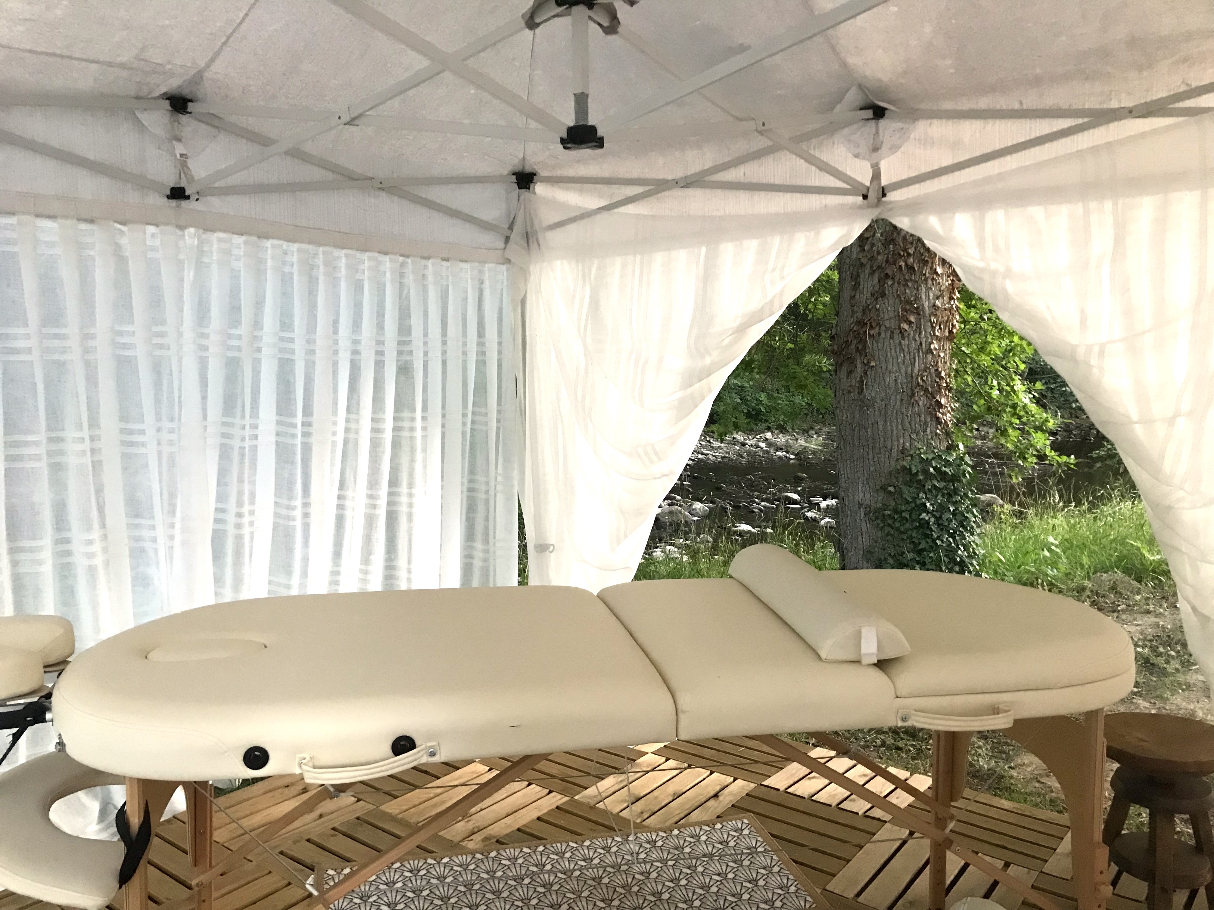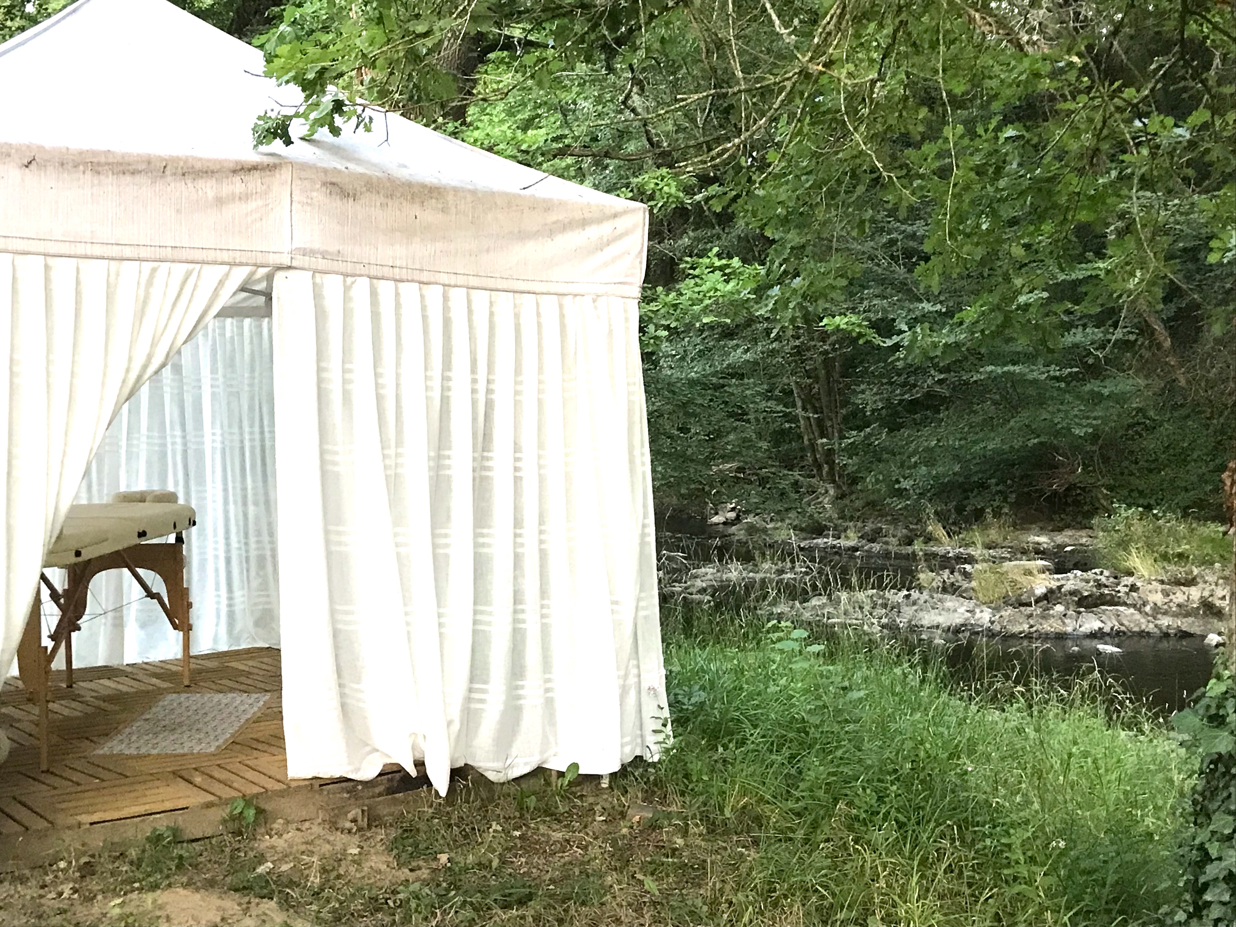 Envie de détente? Pendant toute la belle saison, Virginie vous masse en pleine nature, au doux bruit de l’eau et des oiseaux, à l’abri des regards grâce aux voilages.