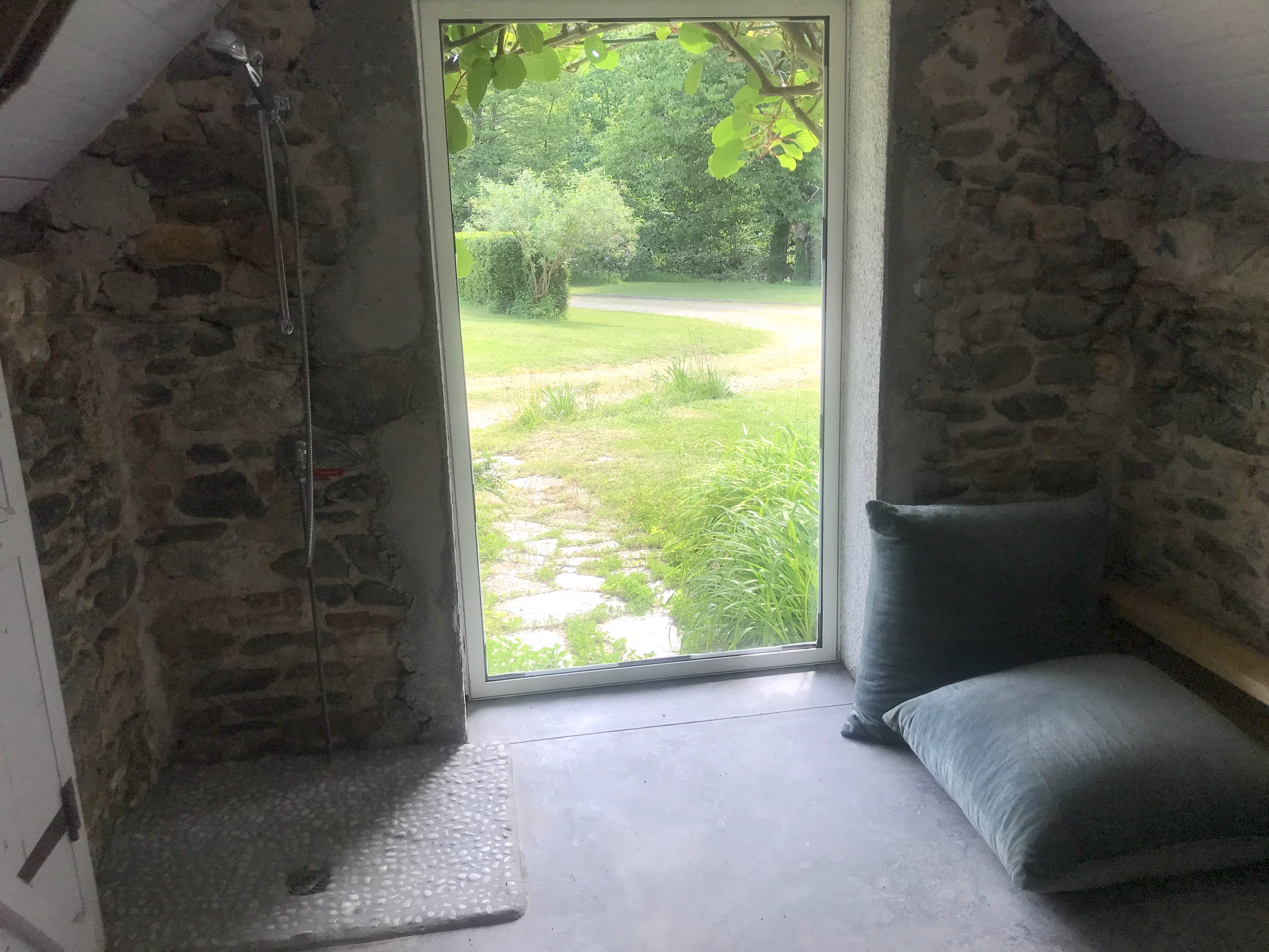 Une petite maison indépendante dans la jardin abrite un espace sauna, complété par un espace de repos et une douche froide